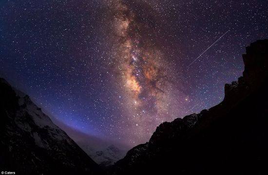 另一张图片显示的是安东所住的迎宾馆,银河在半山腰的一座小屋上空盘旋。拍摄每张照片和曝光都用了数小时,在这期间他必须忍受周围的寒冷环境。家住乌克兰吉图美的安东说:“这张照片是在世界最高山——喜马拉雅山脉上拍摄的。那张山脉上空的银河照片的拍摄地点是玛蒂-科赫拉山谷,该地上空星光璀璨,异常美丽。现在不是旅游季,这里只有热爱大自然的人。晚上没人入睡,他们发出很大噪声,这让我无法忍受。因此我起身穿上衣服,走到外面去散步,这时我突然看到令人惊叹的美丽银河。我以最快速度取出相机,迅速拍下这些照片。”