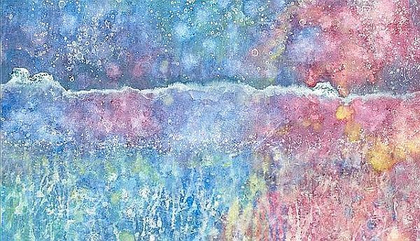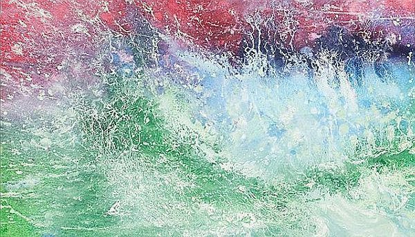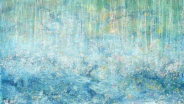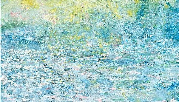 Iris有些畫,如〈水舞〉(上圖),都是對自然場景(如湖泊、田野、天空)的解讀。