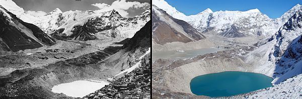 從安普湖(Amphu Lake)遠眺喜馬拉雅山的伊姆扎冰河(Imja Glacier)。左圖:大約在1956年秋天。右圖:2007年10月18日,可明顯地看出冰河的退縮和融冰形成的池塘。