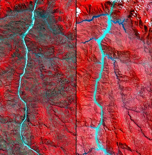 長江是中國最長的河流,也是亞洲第一、世界第三長的河流。左圖:2001年5月20日,右圖:2003年3月25日。這兩個圖像都是從三峽大壩的西邊拍攝,這個世界上最大的水力發電項目,也最具爭議。左圖為大壩峻工前、尚未蓄水的情形。右圖為水庫(含眾多周邊的峽谷)開始局部蓄水的情形。