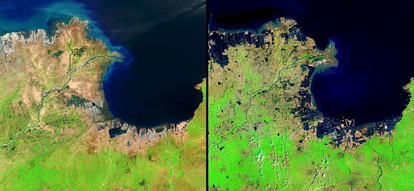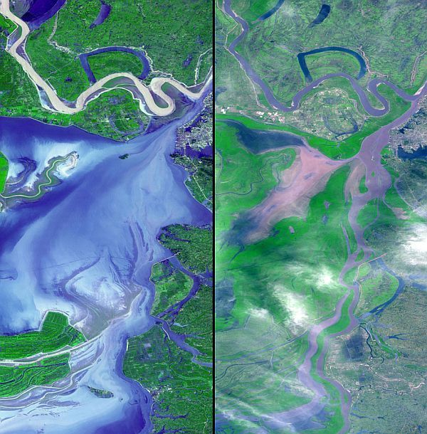 湖南省洞庭湖,水位在洪訊前後的戲劇性變化。左圖:(洪水後) 2002年9月2日。右圖:(洪水前)2002年3月19日。