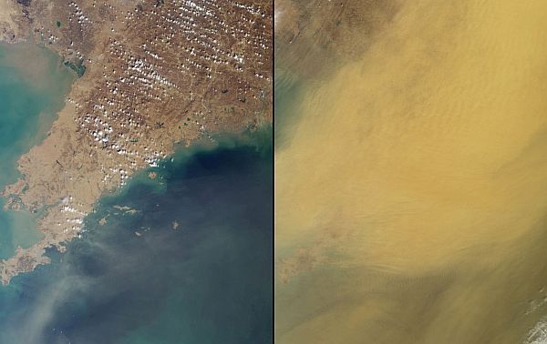 沙塵掩蓋了大部分的遼寧地區、韓國的北部和西部地區。 左圖為2002年3月23日,是一個比較晴朗的日子。右圖為2002年4月8日,是一個沙塵飛揚猛烈的日子。沙塵把中國和蒙古的礦質塵土,以及來自農業,工業和發電的污染物帶到很遠的地方。亞洲的粉塵甚至也曾經在美國科羅拉多州被檢測到。厚重的塵埃雲層阻隔了大量陽光的照射,進而影響到海洋浮游植物的成長,並導致區域氣候的降低。