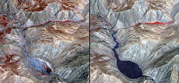 西藏阿里地區發生山體滑坡,堵塞了帕里曲(Pareechu River,扎貢沃普達)的河道,形成一個新的湖泊。左圖:2000年5月24日,右圖:2004年9月1日滿水位時。此一湖泊水位繼續上漲,讓下游的印度境內的居民處於潰堤的威脅中。