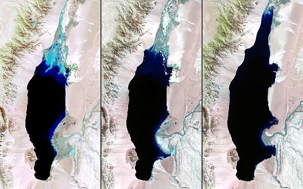 阿雅克庫木湖(Lake Ayakkum)位於青藏高原北部邊界附近,這是一個持續增長的內陸鹹水湖。它和中亞地區許多盆地中的鹹水湖的縮小,恰恰形成強烈的對比,後者因為建築水壩、引水灌溉以前無法居住的沙漠地區,而導致湖泊縮小。相反的,阿雅克庫木湖有冰河和融雪流入小溪流,而得以持續變大。其結果可以從上圖中看出。