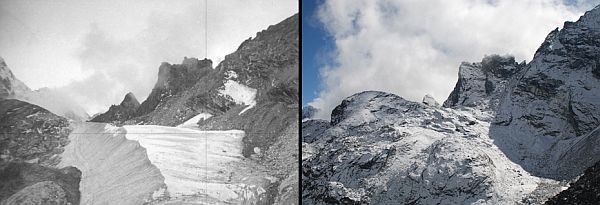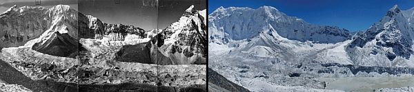 從島峰(Island Peak或Imja Tse)眺望喜馬拉雅山的伊姆扎冰河(Imja Glacier)。左圖:大約在1956年秋天。右圖:2007年10月18日,顯示了冰河已有明顯地撤退與坍崩,並形成新的水池。