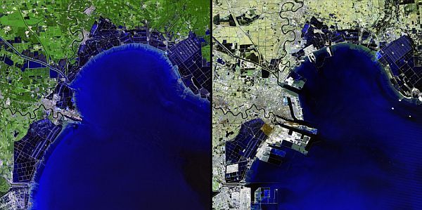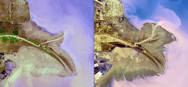 黃河口。左圖:2001年。右圖:2009年。黃河是中國第2大河,世界排名第6長的河流。它一直是中國文明的搖籃,但是頻繁的大洪水也贏得了“中國的悲哀”的名號。歷史上,黃河河道已經發生過很多巨大的改變。目前,黃河最後是流入渤海,但它的出海口還是在山東半島南北移動。上圖顯示此一變化。