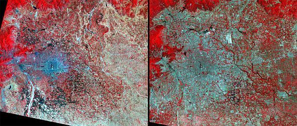 上圖顯示北京從1977年到2011年的成長。左圖為1977年,右圖為2011年。藍色塊表示建築物和道路,紅色塊表示自然和農業植被。在1970年代,很多人從文革被下放的農村回到北京,還有其他人也前來謀職。 1979年帶來了住房建築熱潮。在1980年代,許多工廠從城市中心遷往郊區,居住與工作地點不同逐漸成為常態。北京在2012年人口估計剛剛超過1700萬,人口密度約為每平方公里5000人(每平方英里約13000人)。