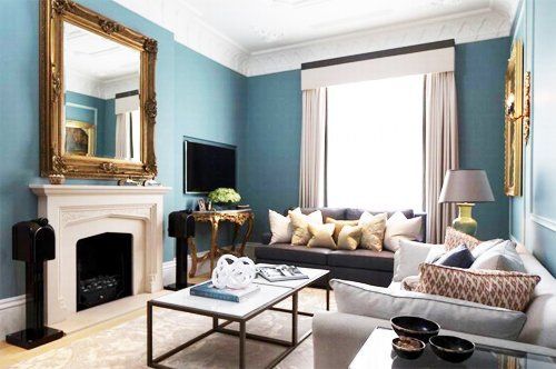在浅蓝带点灰色的墙面,白色壁炉上,悬挂著一面黄金古典框的大方镜,镜子的对面,是两幅艺术油画,仿佛走进欧洲美术馆一隅,飘着古典的幽香情怀,室内一深一浅的褐色与米白色沙发上,安置著各式轻软蓬松的抱枕,沙发旁一盏瓶身简雅质感的小座灯,散发无限暖意,整个客厅高雅富丽,气派不凡。