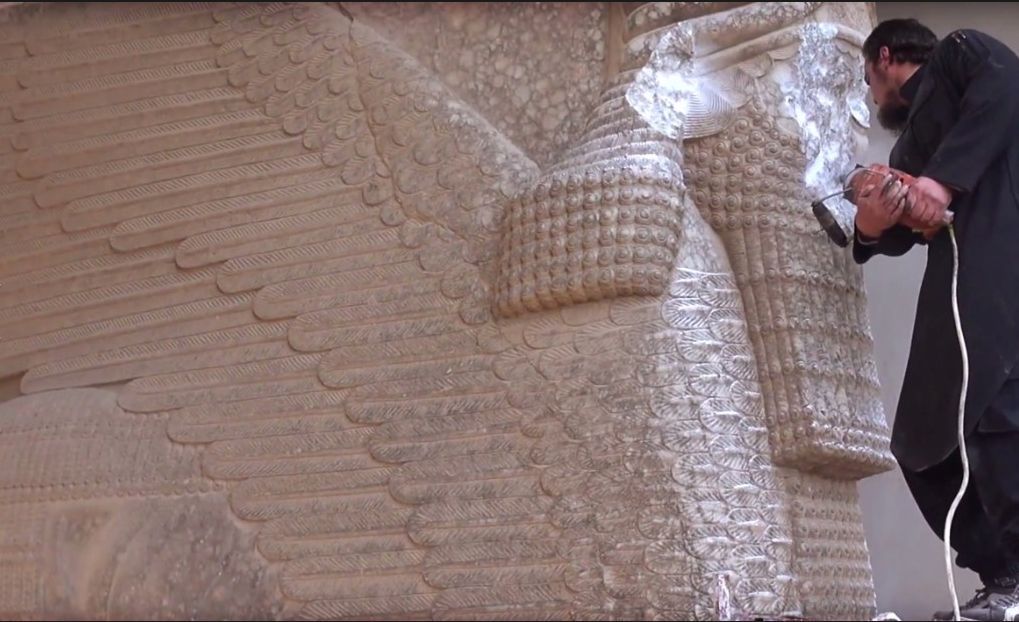 這張照片是從視頻中截取出來的,後來被人們貼到社交媒體之上。真實的反應了與伊斯蘭國組織發生衝突中造成的影響。有一個人拿著鑽機破壞伊拉克摩蘇爾尼尼微博物館中的亞述人保护神有翼公牛。