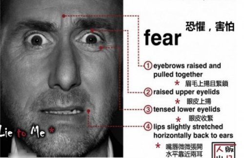 害怕时,嘴巴和眼睛张开,眉毛上扬,鼻孔张大