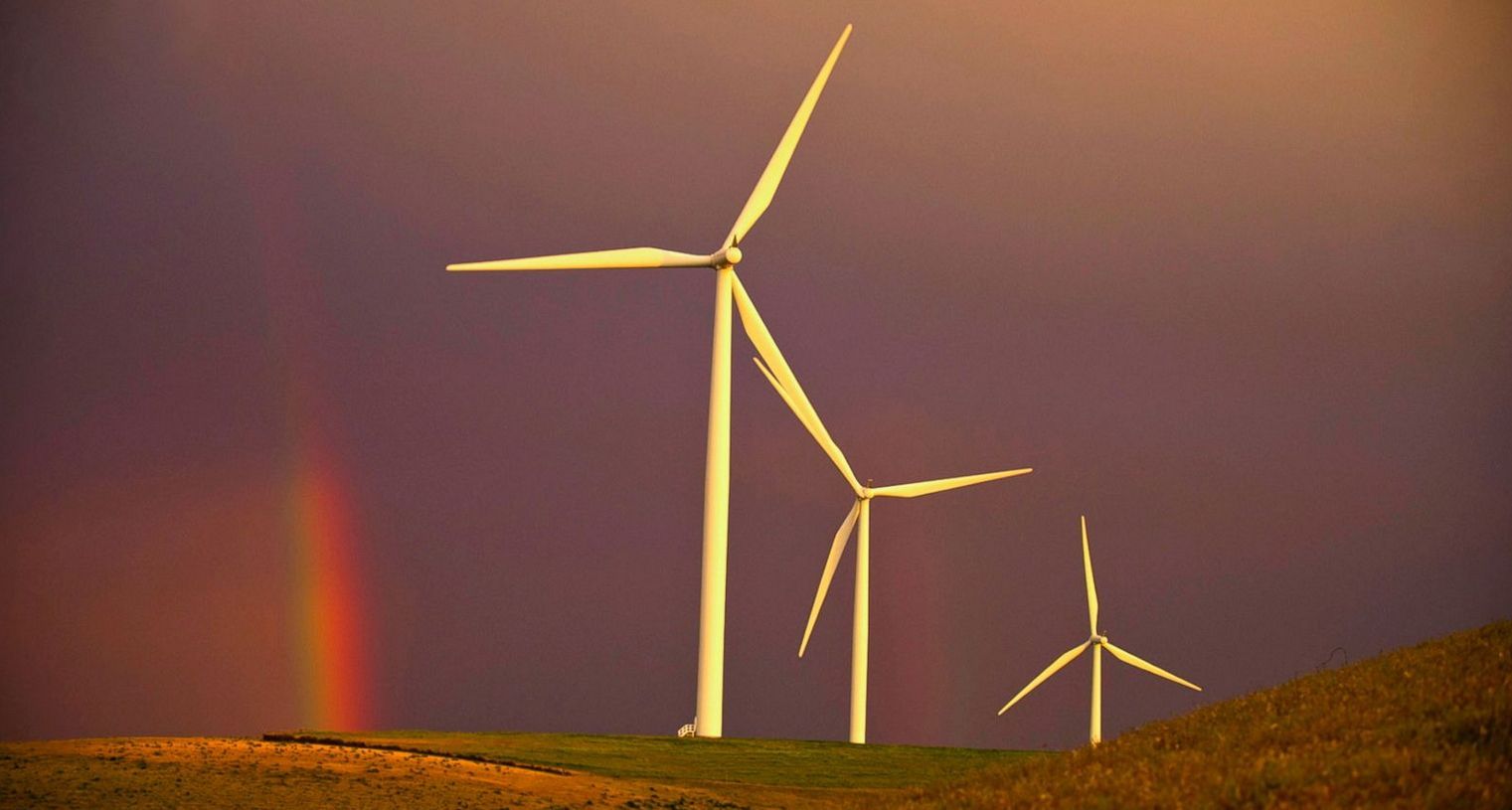 2015年5月18日,华盛顿西南沃拉沃拉的彩虹南端似乎碰觸到了山上的风力涡轮机。