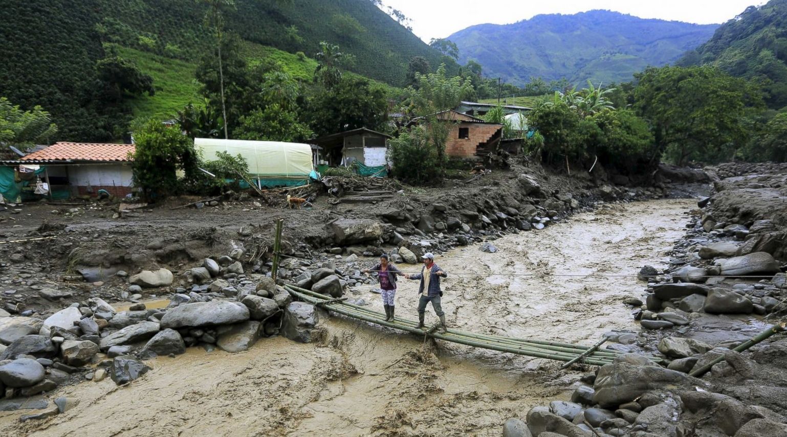 2015年5月19日,哥伦比亚山体滑坡,泥漿湧入居民家中。當地居民搭了一個簡易橋樑,供人們走過。此次哥伦比亚西北部山区滑坡造成50餘人死亡數十人受傷。