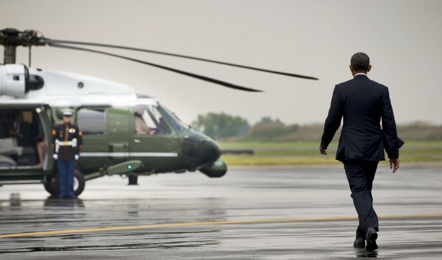 2015年5月18日,在费城国际机场,美国总统奥巴马穿过停机坪走向海军陆战队一号直升机。奥巴马準備前往新泽西州附近的卡姆登,宣布他禁止联邦政府向当地主管機構提供军事装备,并严格控制分配其他武器或裝配用以執法行動。