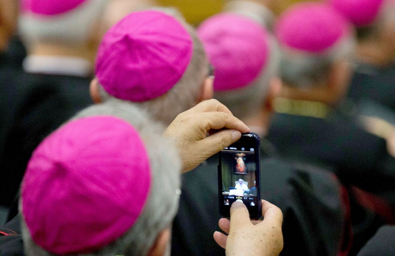 2015年5月18日,一位天主教信徒在梵蒂冈意大利主教团大会会议的开幕式上給正在講話的教皇弗朗西斯拍照。