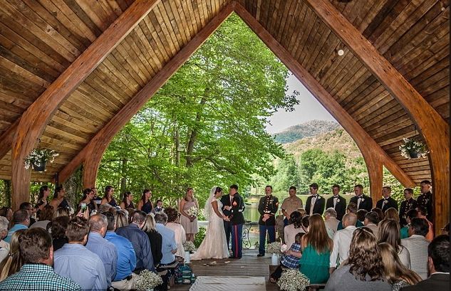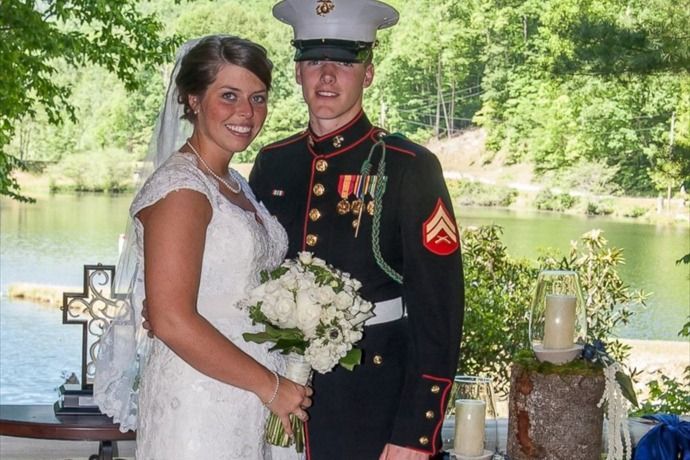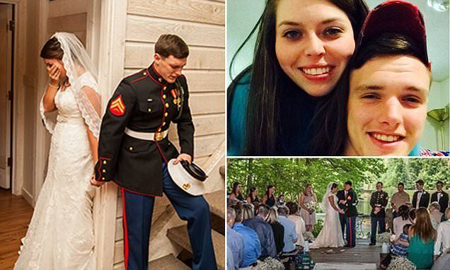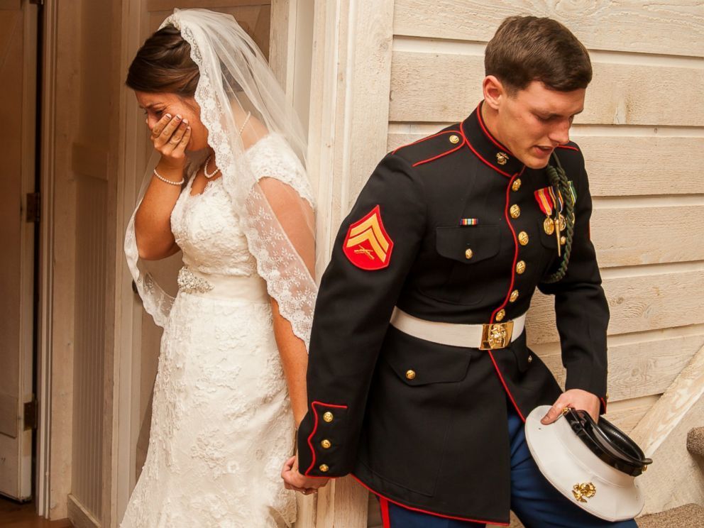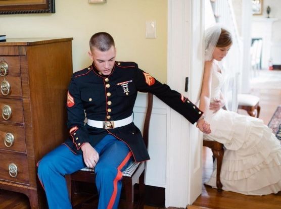 美海军陆战队下士迦勒.爾伍德週六在他與新娘玛吉結婚典禮之前,在北卡罗莱纳州阿什维尔海邊祈禱。在他们的家人和婚礼摄影师德韦恩·施密特的帮助下,迦勒被帶到玛吉所在地小屋前,這對夫妻手牽手,傳統地走到聖壇之前。