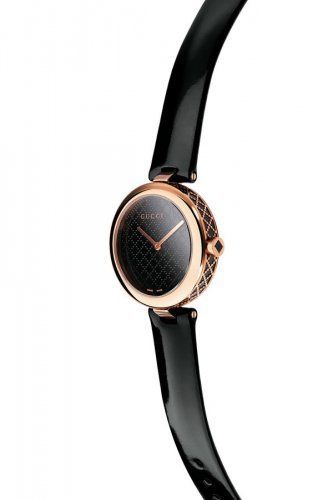 本系列共有不锈钢搭配白色调(32mm、27mm、22mm)以及玫瑰金PVD搭配黑色调及黑色小牛皮表带(32mm和27mm)等款式,菱形图案在同色系不锈钢表壳或采对比色设计的黑色及玫瑰金PVD衬托下,表现耀眼风采。其中四款腕表的表面呈现极简美学,没有数字刻度,另一款则为小码尺寸的奢华款式(22mm),采珍珠母贝表面设计,表面的12点钟、3点钟、6点钟和9点钟位置共缀有四颗钻石时标。Gucci标志和“Swiss Made”(瑞士制造)证明标记分别蚀刻于蓝宝石水晶玻璃镜面之下的12点钟和6点钟方向。