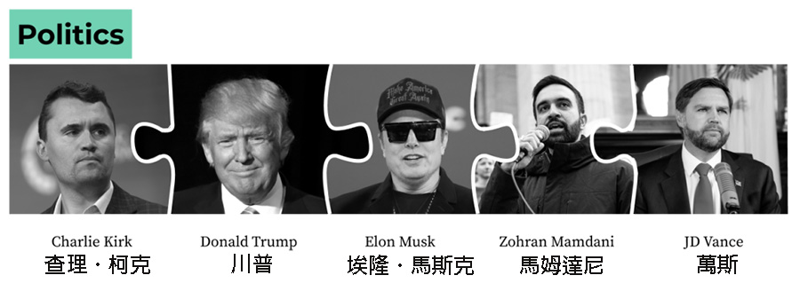 政治是2025年英文《维基百科》最受欢迎文章的另一个主要子主题。排名前20的文章中有5篇属于这一类别。除了上文提到的查理.柯克和美国总统川普之外,还有两篇文章与在美国政府担任或曾经担任要职的人士有关:副总统万斯(JD Vance)和前高级顾问埃隆.马斯克(Elon Musk)。纽约新选出1892年以来最年轻市长马姆达尼(Zohran Mamdani)也挤入政治类阅读热门排行榜。