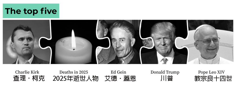 △ 查理.柯克(Charlie Kirk):他是一位美国政治活动家、企业家和媒体名人,于9月在他组织的一场大学校园辩论中遇刺身亡。在遇害后的第二天,关于柯克的文章流览量接近1,500万次,平均每秒超过170次。在2025年全年,柯克文章约43%的流览量来自美国以外地区。