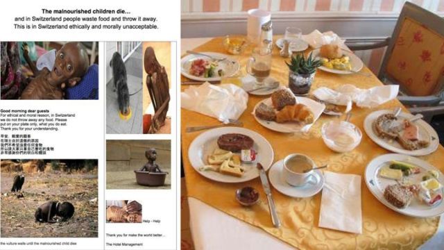 瑞士酒店以挨餓瀕死的兒童照及桌上堆積未吃的食物震懾浪費食物的中國客。