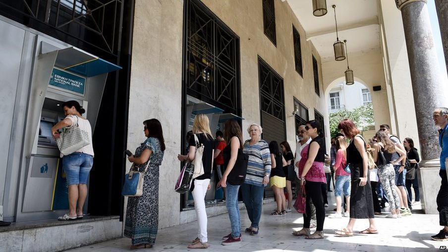 6月27日希臘民眾在銀行外排隊提領現金【新三才記者王明綜合報導】6 月26日,歐元區財長會議拒絕了希臘償還貸款延緩至6月30日以後的提議。歐元區財長在聲明中稱,希臘已「單方面」中止新紓困方案的相關談判。另一方面,6月26日晚間,希臘總理齊普拉斯出乎意料地宣佈,將於7月5日舉行全民公投,由全體希臘人民決定是否接受新的紓困計畫。