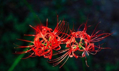 不過此花傳到日本后,就完全走了味。由於石蒜往往盛開在墓地附近,色澤鮮紅似血,花期又近秋分(日本的祭禮節日),加之石蒜葉落花開,花落葉發,永不相見,因此在日本傳說中,此花便帶上了死亡和分離的不祥色彩,較常用於喪禮。有葉子時看不見花,花葉兩不相見,生生相錯。是黃泉路上惟一的風景。遠遠看上去就像血所鋪成的地毯,又因紅得似焰,被喻為“火照之路”,人就在花的指引下通向幽冥之獄。所以彼岸花(曼珠沙華)日本的花語是“悲傷的回憶”。曼珠沙華從接人去忘記一切悲苦的極樂世界彼岸變成了送人去黃泉地獄。