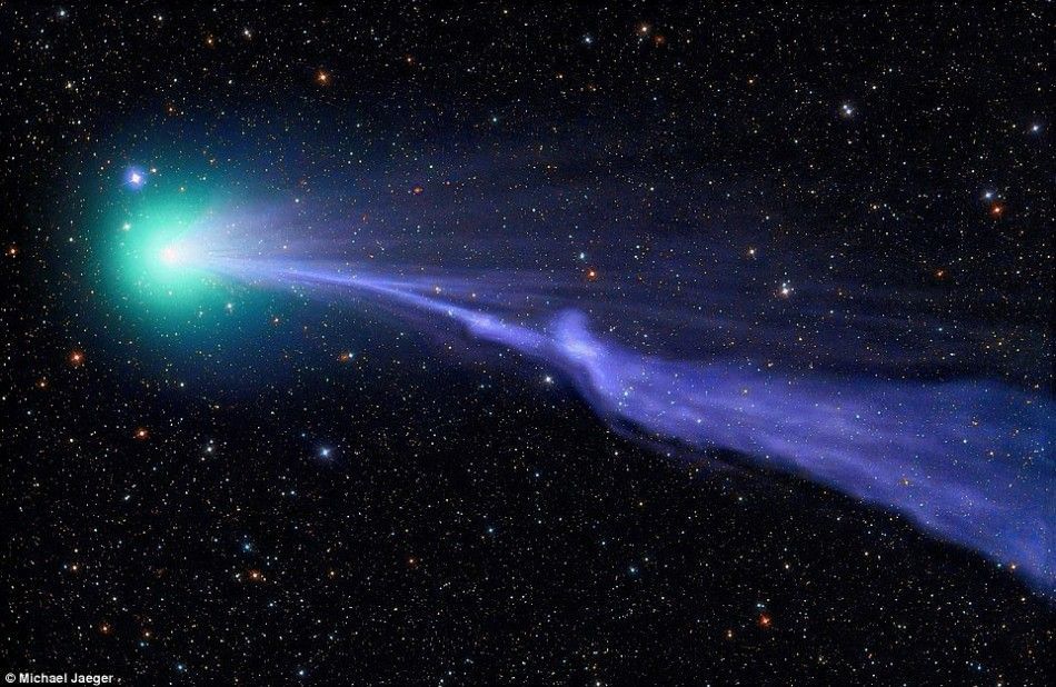 “愛喜彗星”(Comet Lovejoy)划過太陽系,在地球的夜空中呈現一抹暗弱的淡綠色,並將彗星的塵埃一路播撒。這顆彗星的正式編號為C/2014 Q2,在2014年末和2015年初,這顆彗星相當明亮,可以通過雙筒望遠鏡看到,而在某些情況下甚至通過肉眼就能看到