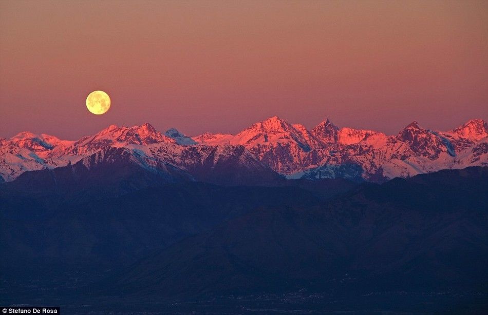 滿月從阿爾卑斯山後方落下。這張照片拍攝於義大利圖靈,時間正值日出之前