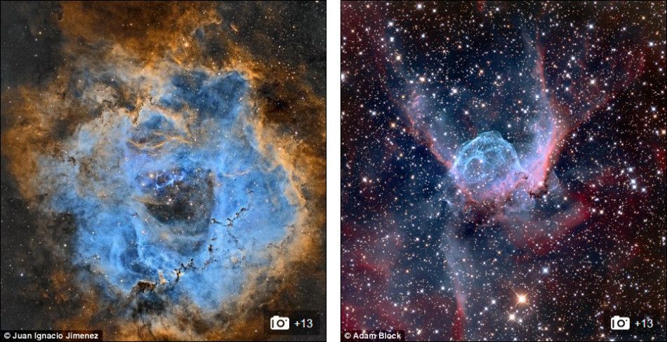 左圖是玫瑰星雲,這是一團巨大的分子雲團,位於麒麟座,距離地球約50光年。右圖則是星雲NGC2359,由於它不同尋常的外形,有時候會被人們稱為“索爾的頭盔”(Thor's Helmet)
