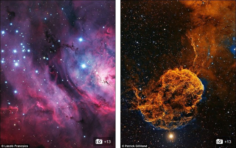 左圖是礁湖星雲,它位於人馬座,距離地球約5000光年,這是一個恆星新生區,有大量恆星正在其中孕育;右圖是IC443,這是一個超新星遺迹,它屬於一顆在3萬年前爆發死亡的恆星留下的殘骸