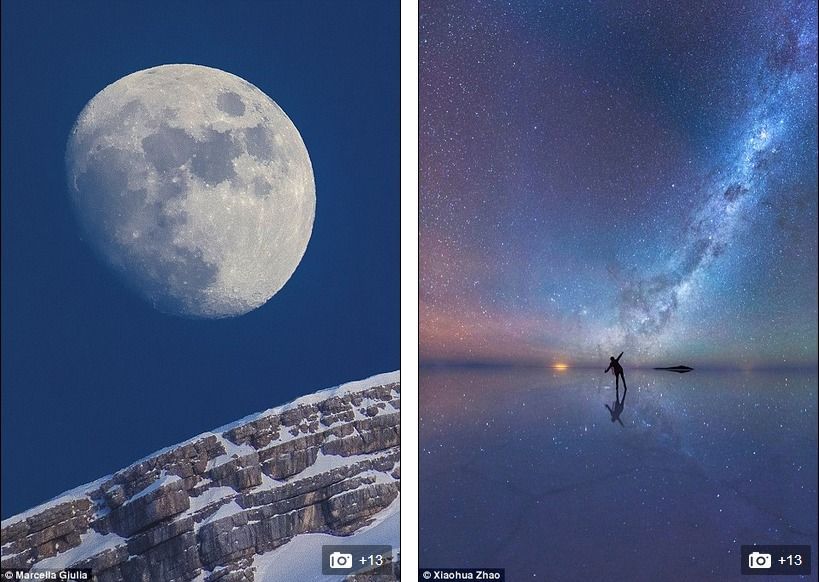 左圖拍攝於義大利聖維托-迪卡多雷小城的一個午後,此時月亮正高掛在遠處山頂之上,白雪覆蓋的山頂和地球唯一的天然衛星形成一種截然的對比;右圖則展示了一位完全被繁星淹沒的觀星者,他的腳下是南美洲玻利維亞境內,世界上最大的鹽沼烏尤尼鹽沼。