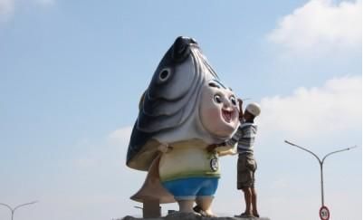 北門永隆社區正進行農村再生計畫,在台17線和市171線路口打造入口意象「虱目魚小子」公仔塑像,以凸顯北門虱目魚產業的特色,沒想到FRP材質的塑像成品不符原創的Q版可愛風,前天一裝上基座,引來負評如潮,讓社區和設計者心情很受傷。但也有遊客和網友覺得塑像「恐怖得可愛」,發起搶救行動,相當搞笑。
