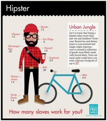 根據非營利組織《Made in a Free World》(MIAFW)調查,如果要滿足一位我們所說「文青」的行頭,從頭到腳包括毛線帽、黑框眼鏡、窄管牛仔褲、郵差包、智慧型手機、濃縮咖啡等裝備,總共需要雇用27名「現代奴隸」。
