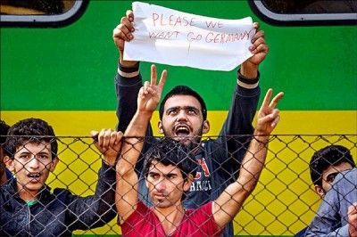 四日仍困守在匈牙利比奇凱火車站的難民,高舉寫著「我們要去德國」的標語,要求當局開動火車