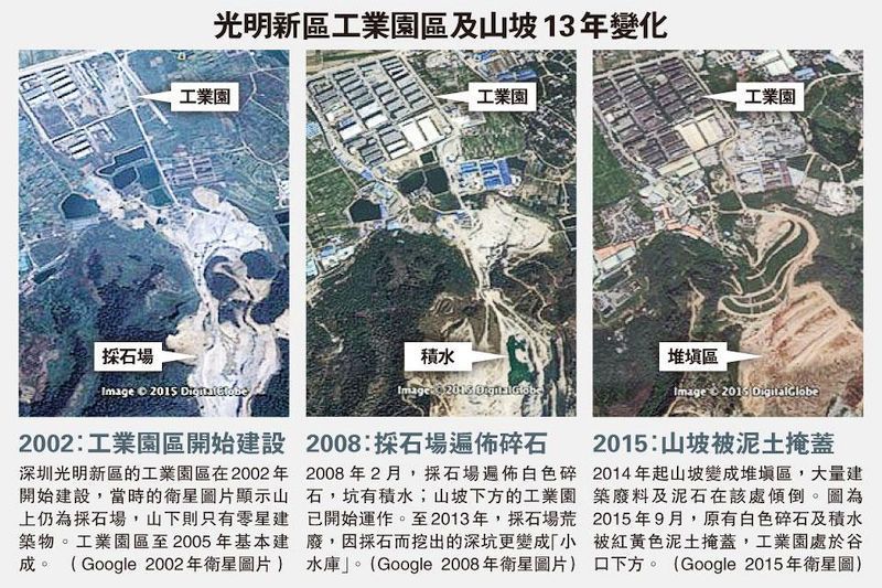 2015年12月20日上午11時40分,廣東省深圳光明新區工業園區發生嚴重山泥傾瀉,截至21日中午12時,官報失聯人數91人,有33棟建築被埋或損毀。但有目擊者稱,至少有數百人被困。