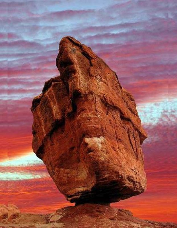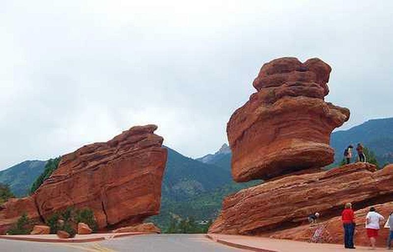 這塊巨大的平衡岩座落於眾神花園。眾神花園位於科羅拉多州斯普林斯的派克峰附近,是一個已登記註冊的國家天然地標。平衡岩赫然聳現在一條鋪面交流道上方,賦予這裡引人注目的景色。我們有必要提醒在這條道路上開車的人“小心駕駛”,否則的話,平衡岩可能就是他們最後看到的東西。最後一幅圖片展現了構成平衡岩的砂岩層。在漫長的歲月變遷中,支撐平衡岩的狹窄底座不斷風化,導致部分硬度較大的紅色砂岩脫離較軟的石陣。