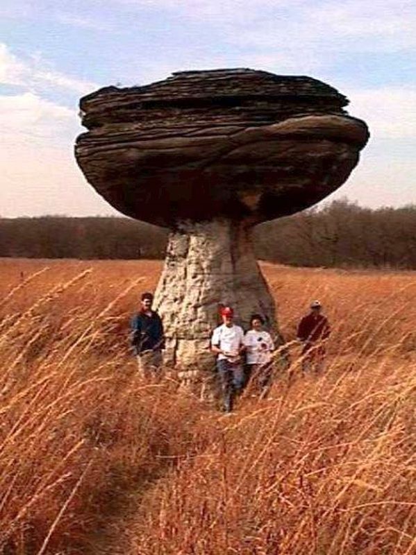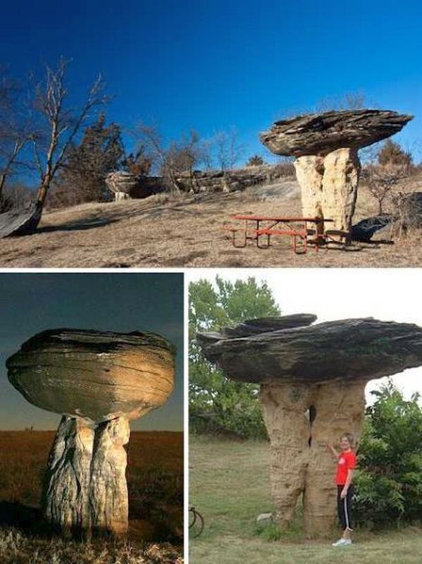 蘑菇岩州立公園位於堪薩斯州的煙山地區,雖然面積只有區區5英畝(約合30公里),但這裡卻擁有地球上一些最怪異的平衡岩,比如蘑菇岩。蘑菇岩就像是一個巨大無比的蘑菇,看着它,小孩子可能認為《愛麗絲夢遊仙境》中抽着水煙袋的毛蟲就躺在上面休息。