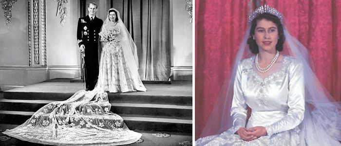 〈第四套〉英国女王伊丽莎白二世于1947年结婚(二战结束后不久),在当时她只能用配给卡购买材料来制作她华丽的晚装。