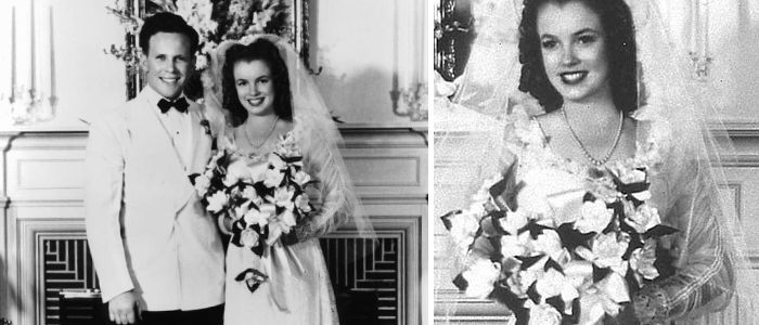 〈第七套〉你甚至可能不会认识这个新娘在她的第一次婚礼时的礼服。玛丽莲•梦露在1942年嫁给吉姆•多尔蒂时还是黑发(在她嫁给了迪马乔和阿瑟•米勒之前)。