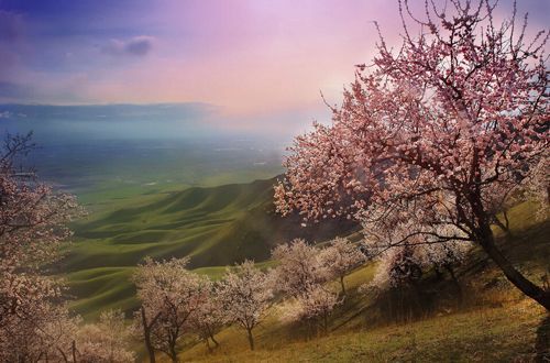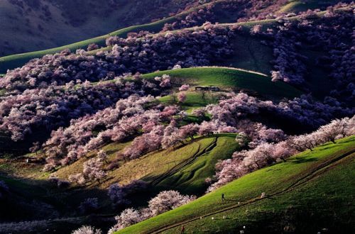 相信你曾在很多地方被這樣的圖片震撼過——春天初綠的山腰溝谷之間,一樹樹一叢叢的粉色杏花蔓延開來,既有大氣磅礴的場面,又有形單影隻的嫵媚。這些絕美圖片的出處就是新疆伊犁杏花溝。今年花開早,如果你想親眼看看這勝似仙境的美景,就抓緊時間吧。