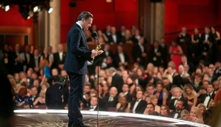 李奧納多在其致詞的下半段開始,提到「神鬼獵人」影片雖然講的是人與自然環境的關係,但卻因為人類集體的不作為,讓2015年成為地球史上最熱的一年,迫使劇組人員為了尋找合適的雪景,得遠征到南極附近才行(原先預定在加拿大,因為氣候過熱無法順利取景)。