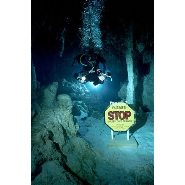2007年11月,墨西哥當地的洞穴潛水訓練師羅尼-瓦倫西亞穿過格蘭沼穴入口處的警示標誌。格蘭沼穴位於墨西哥昆坦納魯圖魯姆附近,是當地最受歡迎的水下洞穴之一。[page]