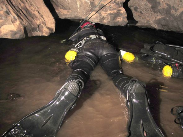 英國的洞穴潛水場所通常都非常危險。但是,法爾認為這有助於培養更優秀的潛水運動員。法爾表示,“只要你能在這裡潛水,你就可以在世界上任何地方潛水。這裡的水下洞穴很狹窄,水很冷,而且能見度也很低。當水下的泥沙被攪起時,你似乎被包圍在一片泥沙雲中,找不到任何方向感。”本圖拍攝於布雷康-比康斯洞穴。