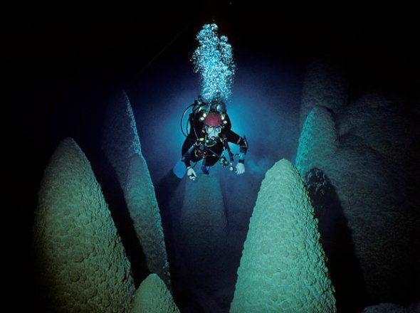 2002年,在巴西南馬托格羅索州的米莫索洞穴中,洞穴潛水員菲爾-多特正在一些神秘的圓錐體之間潛水。