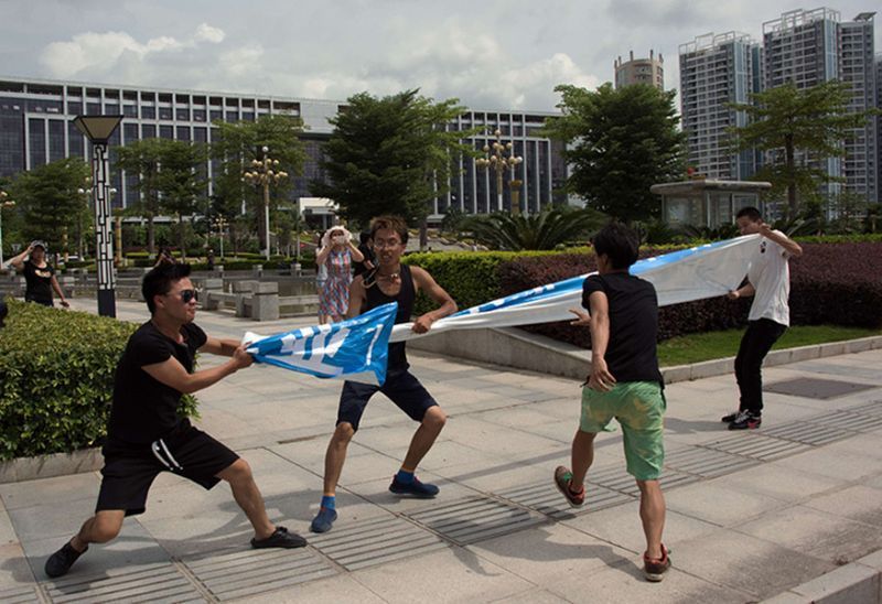愛護動物活動人士在玉林地方政府大樓前抗議狗肉節,與地方官員扭打在一起。