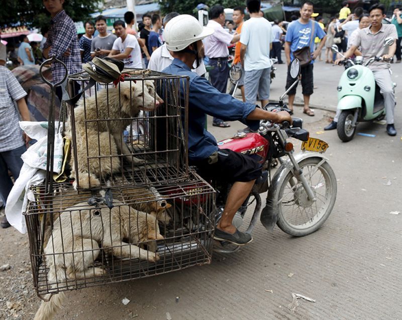 在玉林狗肉節當天,狗販子把整個籠子的狗,用自行車載到狗肉市場。