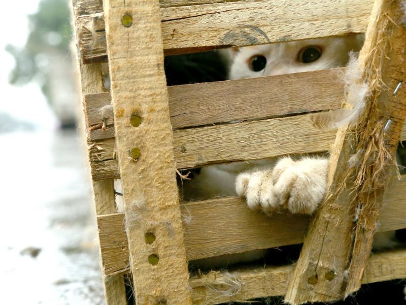貓咪被載到市場待宰前,從籃子裡往外看。