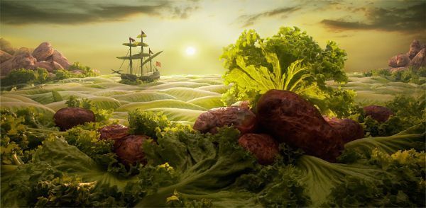【新三才讯】對於用食物雕刻的作品,相信大家看過不少,但是你絕對沒看過下面的場景。一個個全部由蔬菜水果、麵包以及漁肉等食物組成的場景,一副副令人匪夷所思的畫面。而攝影師Carl Warner就是這些場景的設計者。他用藝術家特有的靈感,把各種夢幻般的場景展現給大家,你甚至察覺不出這是用食物建造的。