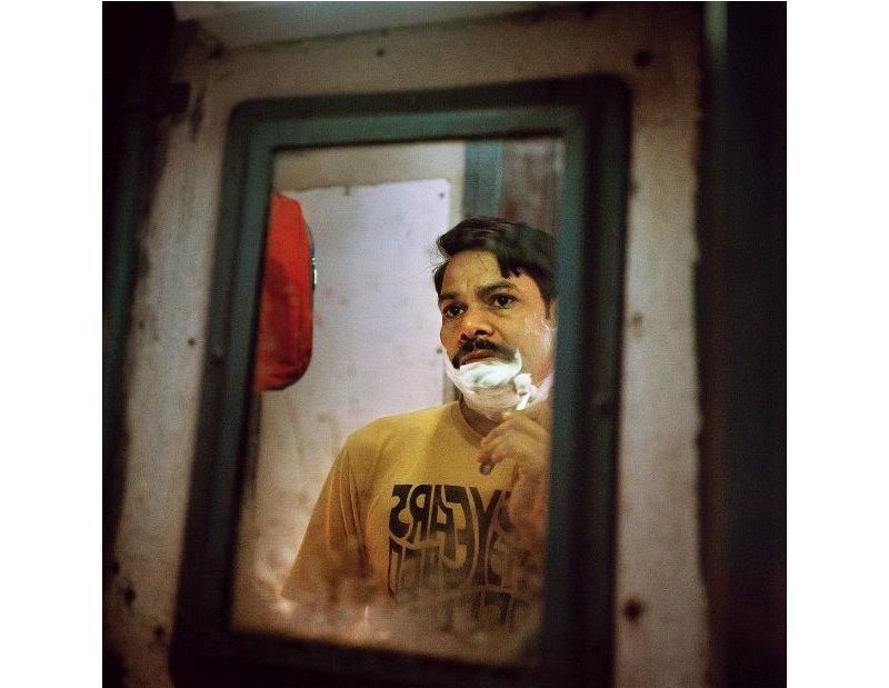 在火車抵達喀拉拉邦的目的地之前,一名乘客正在刮鬍子。在火車行程的好幾天中,許多人都沒有機會淋浴,因此必須共用盥洗的公共空間。