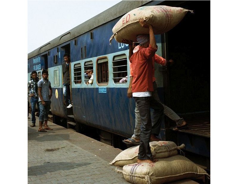 在阿薩姆邦(Assam)高哈蒂(Guwahati)火車站,若干工人正在把貨物搬上一列火車上。