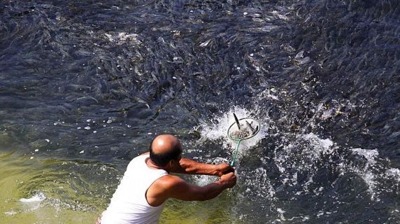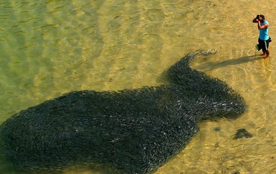 有幾位經驗豐富的老人認出了這些魚的種類,它們基本上都是沙丁魚、鳳尾魚、鱸魚和鯖魚。令人興奮的是,這些魚群無一例外全部都是可食用的魚類。圖為一位遊客正在拍照紀念這難得一見的景象。